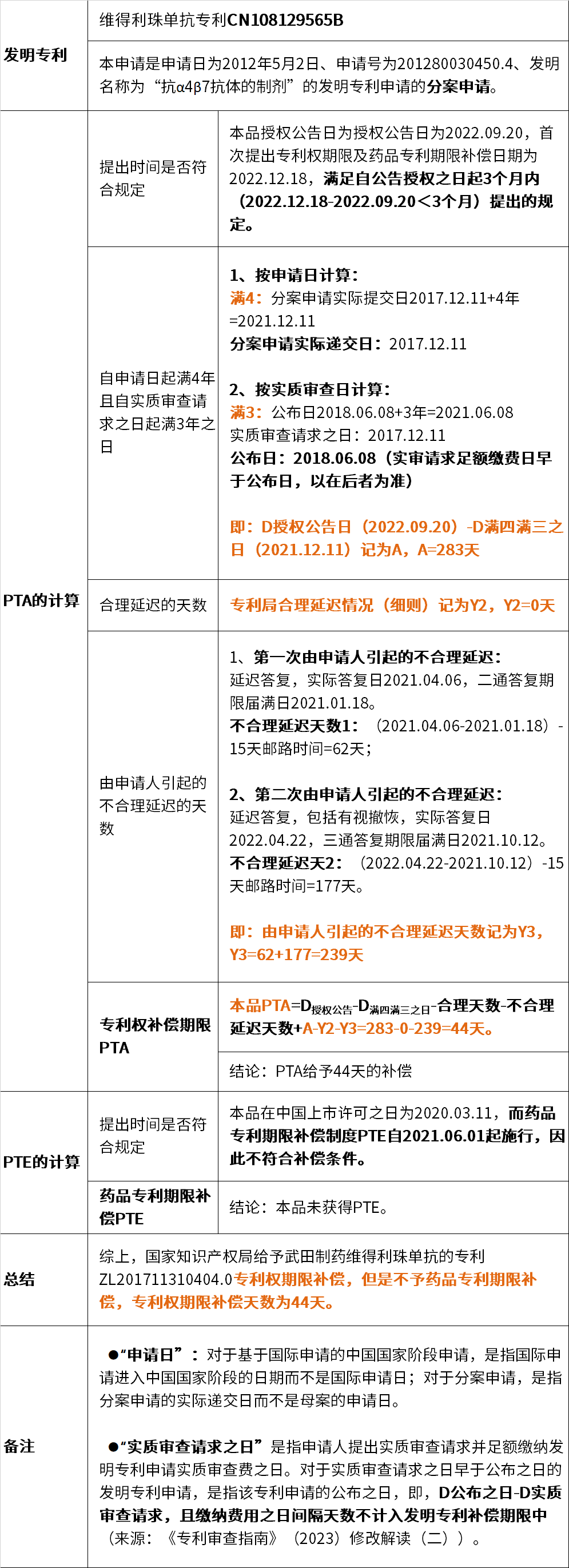 下面通過(guò)案例來(lái)更深入了解專利權(quán)期限補(bǔ)償,維得利珠單抗專利為國(guó)內(nèi)首批獲得專利權(quán)期限補(bǔ)償審批的發(fā)明專利,但未獲得藥品專利期限補(bǔ)償。