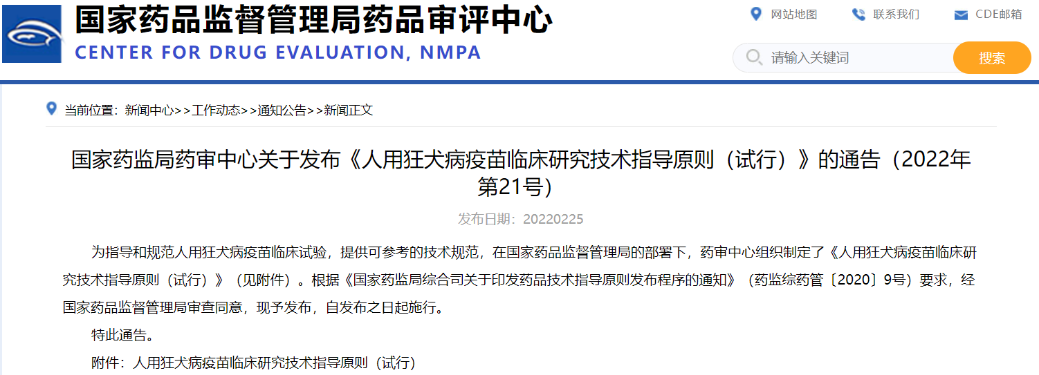 國(guó)家藥監(jiān)局藥審中心關(guān)于發(fā)布《人用狂犬病疫苗臨床研究技術(shù)指導(dǎo)原則(試行)》的通告(2022年第21號(hào))