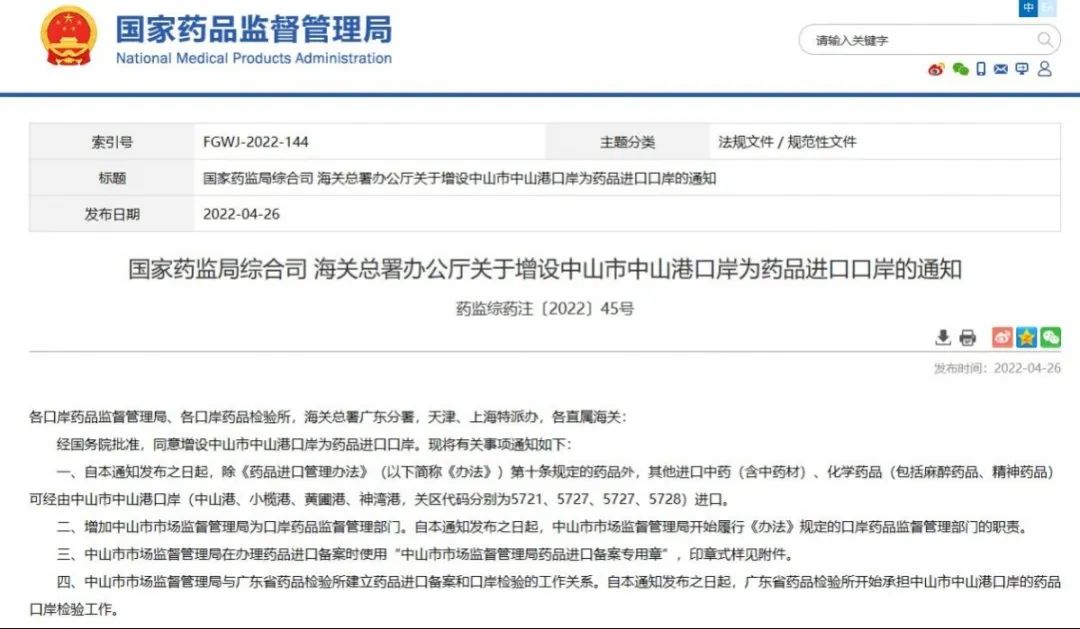 國家藥監(jiān)局綜合司 海關(guān)總署辦公廳關(guān)于增設(shè)中山市中山港口岸為藥品進口口岸的通知