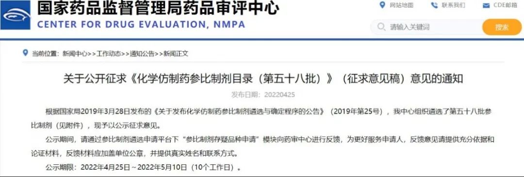 關(guān)于公開征求《化學(xué)仿制藥參比制劑目錄(第五十八批)》(征求意見稿)意見的通知
