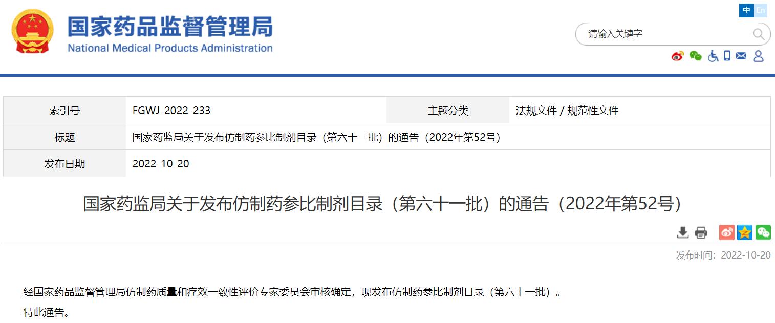 國家藥監(jiān)局關于發(fā)布仿制藥參比制劑目錄(第六十一批)的通告(2022年第52號)