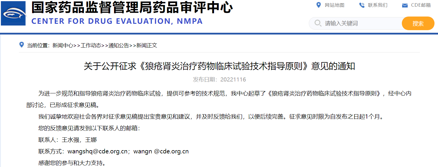關(guān)于公開征求《狼瘡腎炎治療藥物臨床試驗技術(shù)指導原則》意見的通知