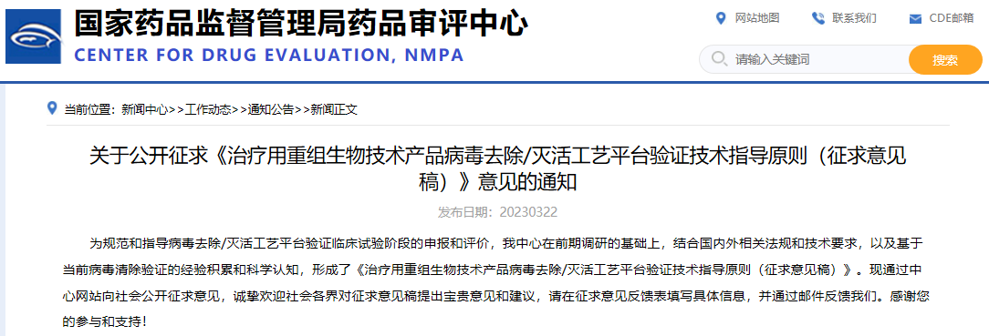關(guān)于公開征求《治療用重組生物技術(shù)產(chǎn)品病毒去除/滅活工藝平臺(tái)驗(yàn)證技術(shù)指導(dǎo)原則(征求意見稿)》意見的通知