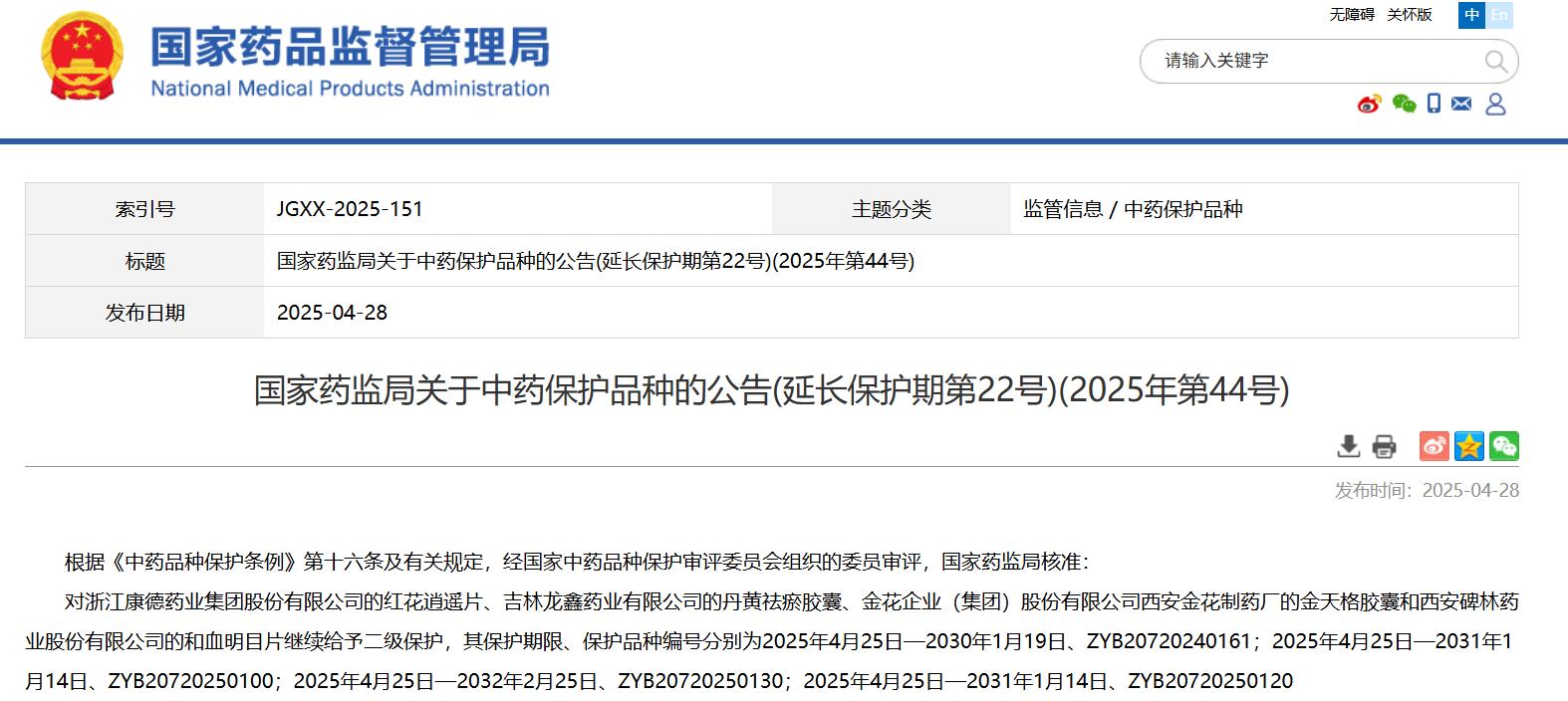 國家藥監(jiān)局關(guān)于中藥保護品種的公告(延長保護期第22號)(2025年第44號)