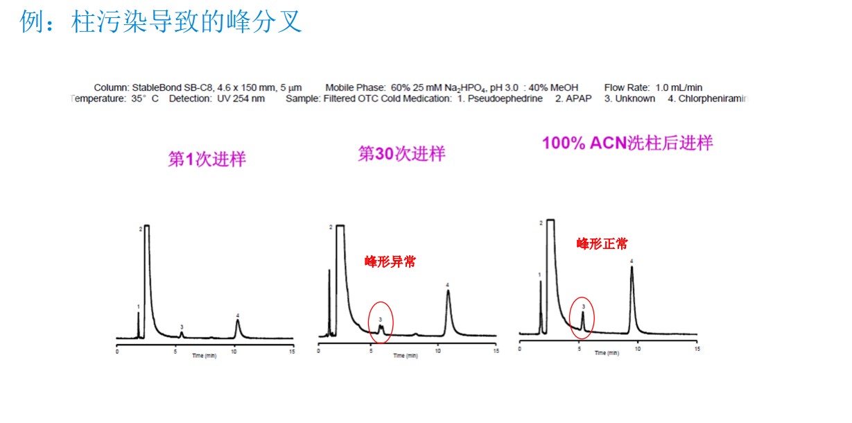 色譜柱在使用過程中因?yàn)闃悠坊蛘吡鲃酉鄮砦锢眍w?;蛘呋瘜W(xué)吸附,引起色譜柱的污染,這時(shí)會在色譜圖上有明顯的變化。出現(xiàn)色譜柱污染時(shí),清洗或反沖清洗則需要根據(jù)色譜柱的特性進(jìn)行操作。清洗或反沖清洗反相色譜柱時(shí),用以下溶劑至少各30倍柱體積沖洗。
