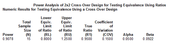 試驗(yàn)設(shè)計(jì)為:交叉、兩制劑、兩周期;假設(shè)檢驗(yàn)的顯著性水平(Alpha)設(shè)置為 0.05,試驗(yàn)設(shè)計(jì)的把握度(Power)為 0.8,T/R 比值設(shè)定為 0.95,等效界值設(shè)定為 80.00%-125.00%,分別以個(gè)體內(nèi)變異為 15% 和 30% 為例,進(jìn)行計(jì)算,結(jié)果如下: