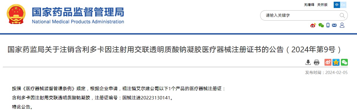 國家藥監(jiān)局關(guān)于注銷含利多卡因注射用交聯(lián)透明質(zhì)酸鈉凝膠醫(yī)療器械注冊證書的公告(2024年第9號)