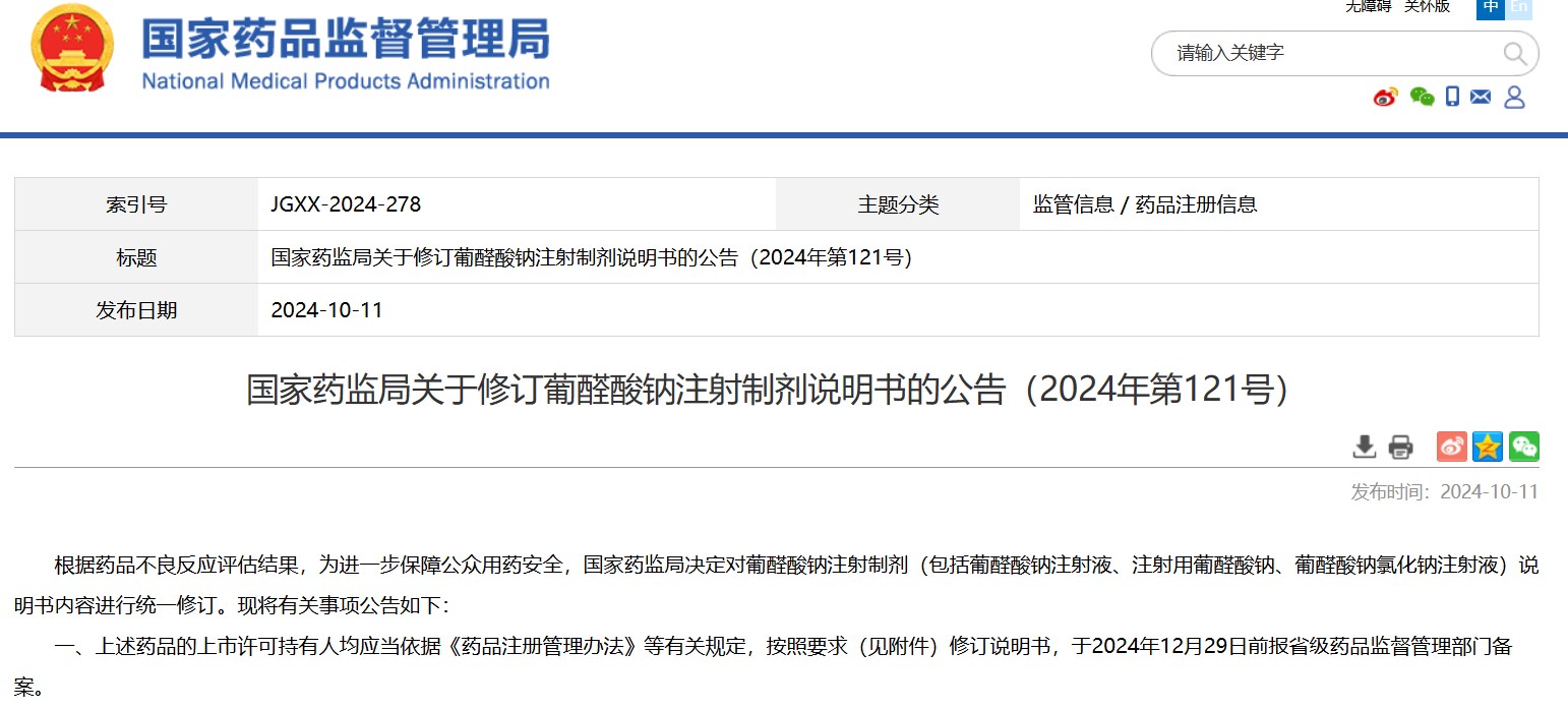 國(guó)家藥監(jiān)局關(guān)于修訂葡醛酸鈉注射制劑說(shuō)明書(shū)的公告(2024年第121號(hào))