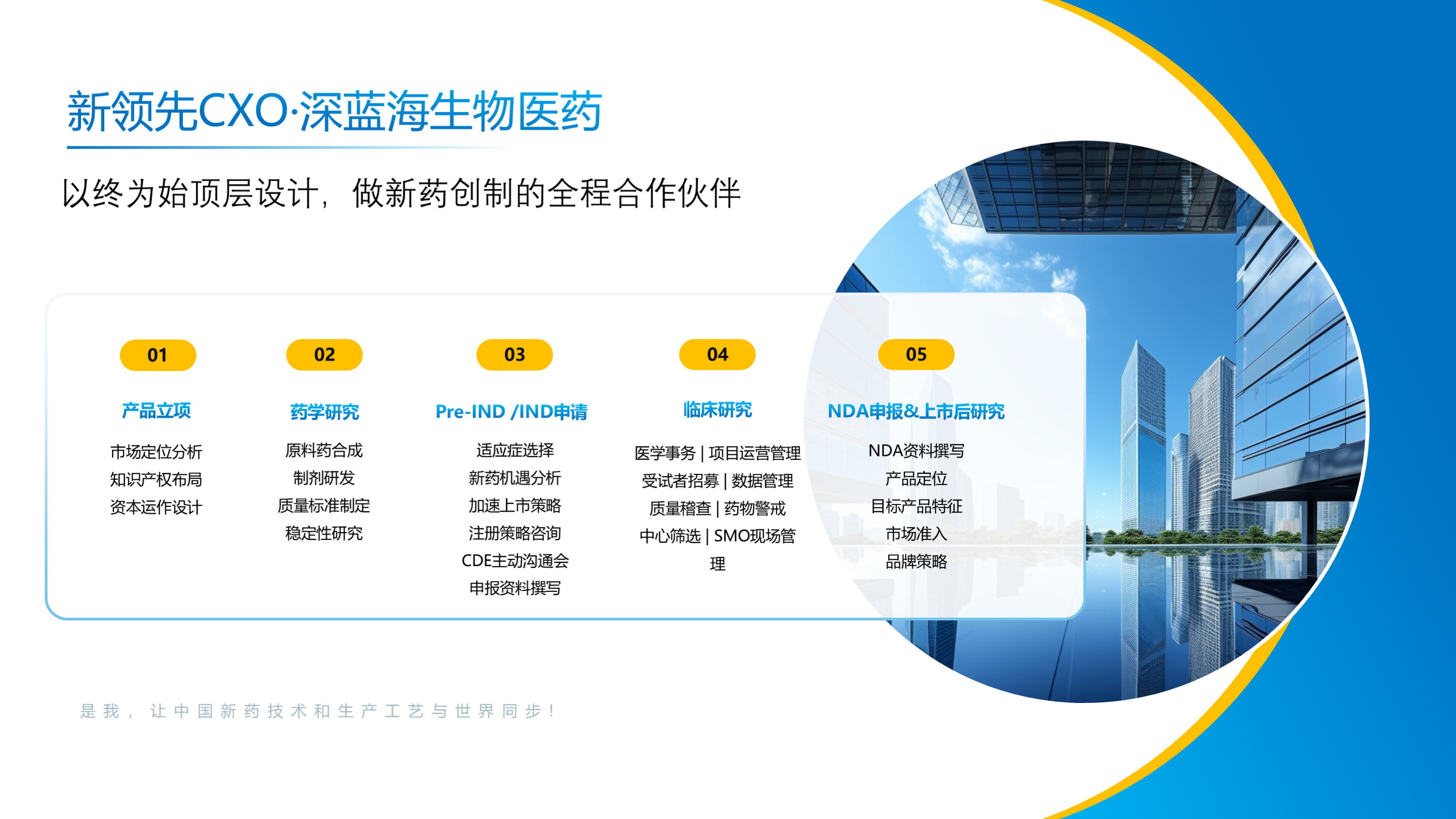 深藍海生物醫(yī)藥是新領(lǐng)先醫(yī)藥(股票代碼600222)在臨床CRO領(lǐng)域的子品牌,成立于2007年,秉持“以終為始,頂層設(shè)計,做新藥創(chuàng)制的全程合作伙伴”的服務(wù)理念,為全球藥企提供覆蓋生物藥、化藥、中藥、醫(yī)療器械、細胞與基因治療等I-III期臨床研究、生物等效性研究、上市后研究、第三方稽查、IND和NDA申報以及醫(yī)學事務(wù)等服務(wù)??蓾M足不同研發(fā)型企業(yè)的臨床研究定制需求,為國內(nèi)外客戶打通新藥上市前關(guān)鍵瓶頸。